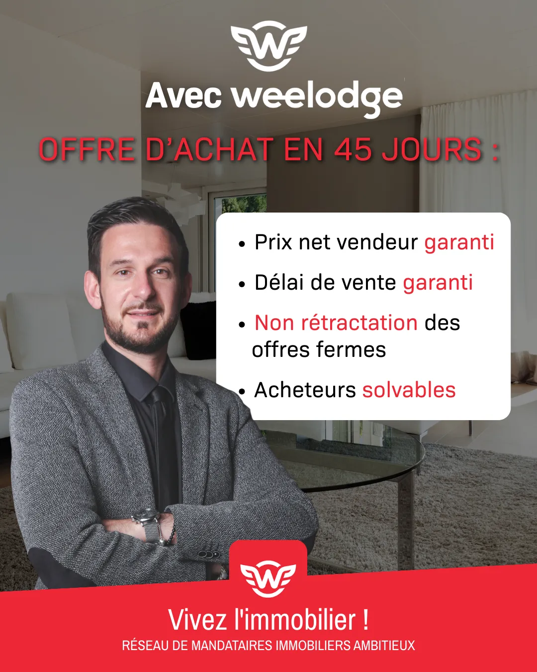 Fort de 10 ans d’expérience dans le secteur immobilier, Weelodge se positionne comme le réseau humain et innovante experte de la région. Notre engagement à vendre votre bien au meilleur prix, dans un délai de 45 jours, avec un service sans effort pour vous, nous distingue clairement. De plus, nos garanties exclusives et notre stratégie de communication dynamique nous permettent d’atteindre rapidement les acheteurs potentiels.
